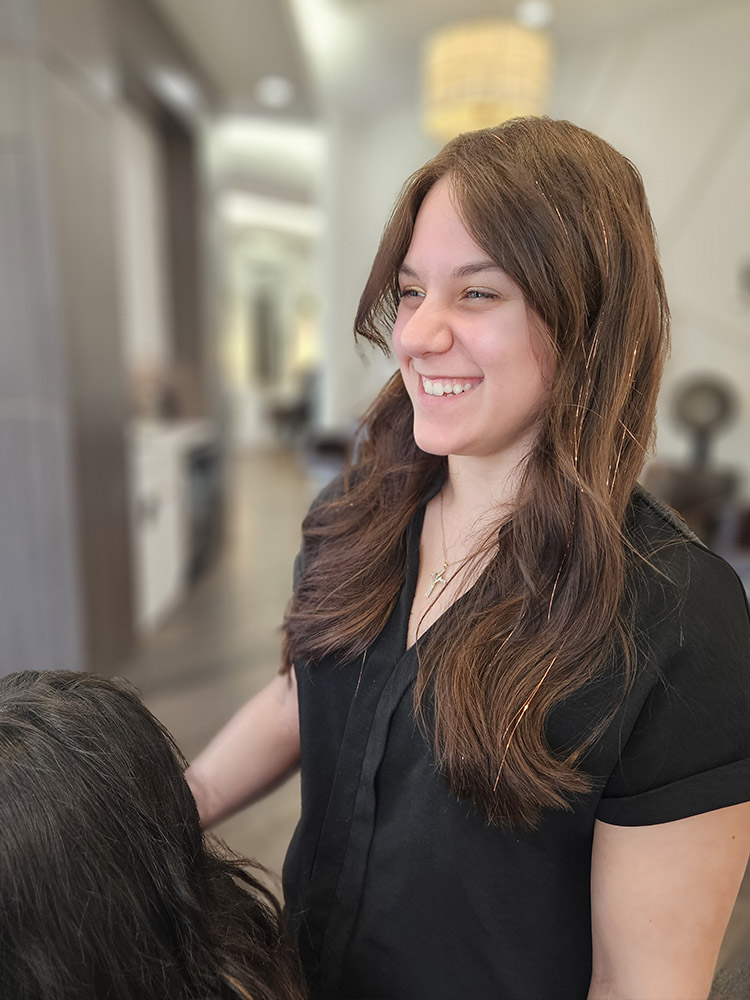 Migena is a talented stylist who trained at the International Institute of Cosmetology in Wethersfield. With two years of experience, she specializes in cutting, coloring, styling, extensions, and treatments. As a bridal styling specialist, she has a passion for creating elegant, personalized looks for every occasion. Her attention to detail and artistic touch ensure each client leaves feeling confident and beautiful.